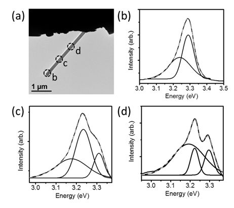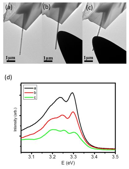 圖1:(a) 原位透射電子顯微鏡光學(xué)-光電測(cè)量系統(tǒng)應(yīng)用原理圖;(b) 單根ZnO納米線的TEM圖像,電子束被聚焦在納米線的末端。(c) 圖解ZnO納米線的發(fā)光機(jī)制; (d) 典型的CL譜。