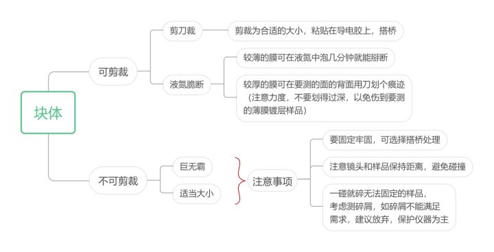 1.塊體樣品。直接可以用導(dǎo)電膠粘在樣品臺(tái)上測(cè)試,若需拍塊體或者薄膜截面,需明確截面制備方法,一般可以通過剪刀裁剪或者液氮脆斷兩種方式來制備樣品。